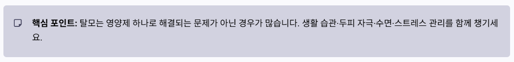 유전성 탈모, 호르몬·갑상선 문제, 염증성 두피 등은 비오틴으로 해결이 어렵습니다. 이 경우 비오틴은 ‘보조’일 뿐이고, 오히려 진단·치료 타이밍을 놓치지 않는 것이 더 중요합니다.