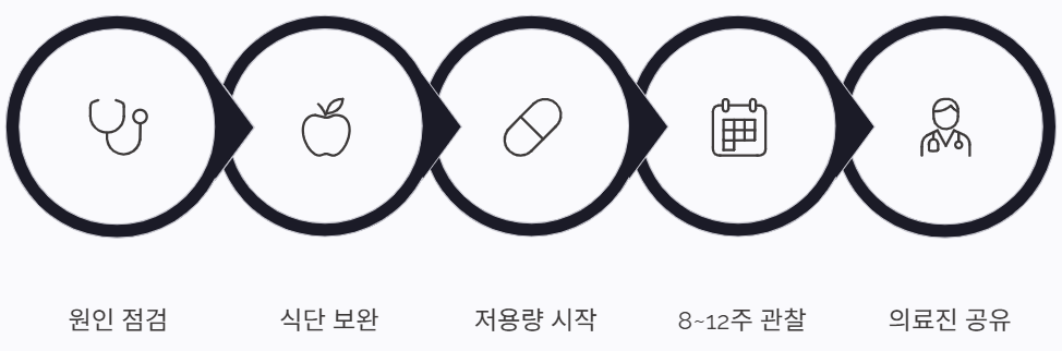 - 원인 점검 → 2) 식단 보완 → 3) 저용량으로 시작 → 4) 8~12주 기록 → 5) 검사/약 복용 시 의료진 공유