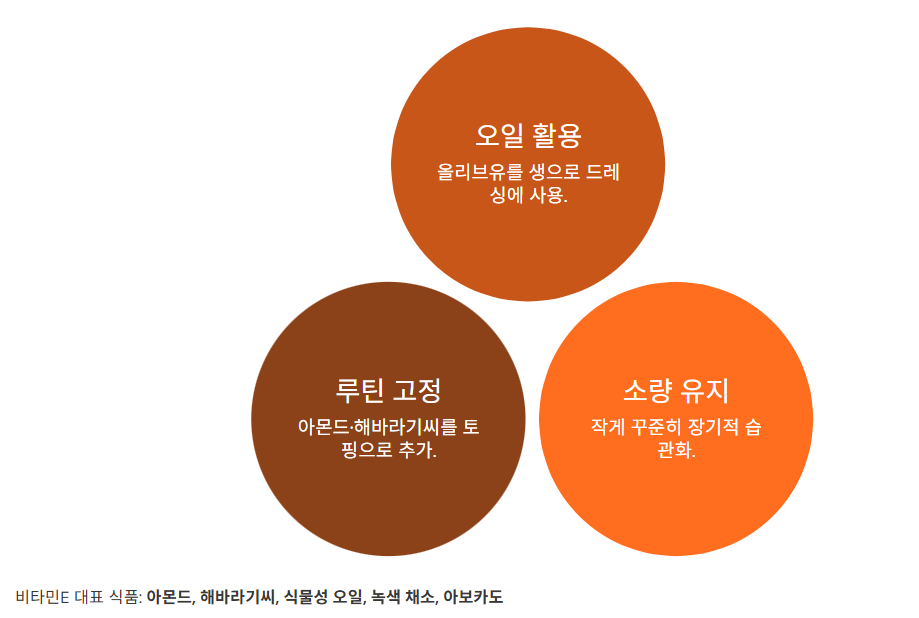 오늘부터 딱 하나만 해보세요. 샐러드에 올리브유 1스푼, 혹은 아몬드 소량 토핑. 작은 습관이 비타민E 섭취를 ‘자동화’해줍니다.