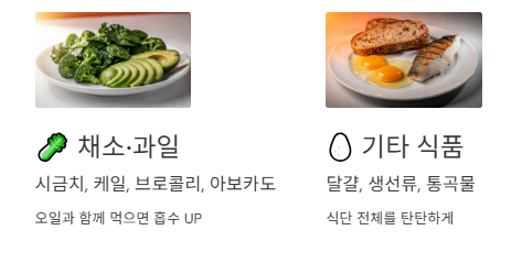 포인트: 채소의 비타민E는 오일과 함께 먹으면 식단 구성상 만족도가 좋아요(샐러드+올리브유처럼).