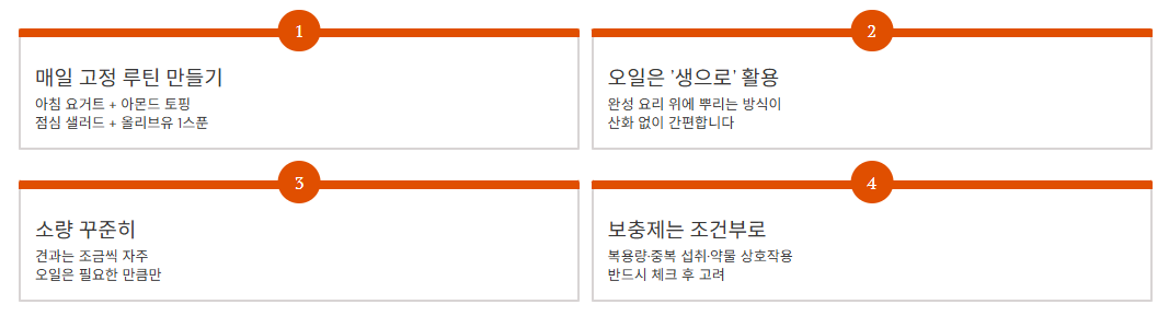 - 성공 포인트는 한 가지 루틴 고정 → 오일은 생으로 활용 → 소량 꾸준히입니다.
