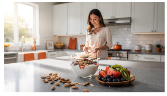 - 아침: 요거트에 아몬드/해바라기씨 토핑