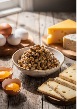 낫토, 달걀, 치즈, 육류, 녹색 채소를