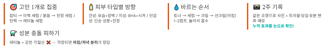 - 주의 조합 : 레티놀 + 강한 각질산(AHA/BHA) / 고함량 비타민C + 각질산(민감하면 특히)