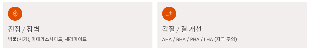 - 각질/결 개선 : AHA/BHA/PHA/LHA 등(자극 주의)