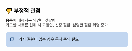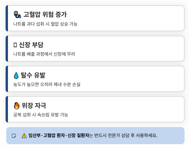 특히 임산부, 고혈압 환자, 신장 질환자는 반드시 섭취를 피하거나 전문가 상담이 필요합니다.