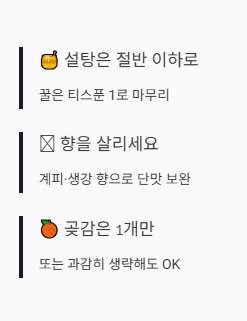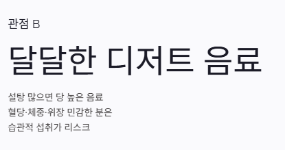 - 디저트 대체 목적: 달게 하더라도 양을 작게(한 컵 전부 X)