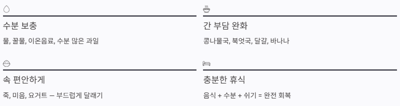결국 숙취해소의 핵심은 “자극적인 해장”보다 “부드러운 회복”에 있습니다.