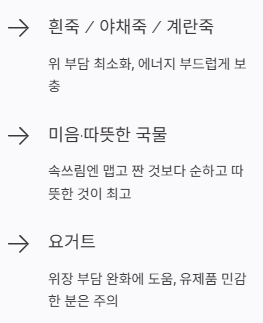흰죽, 야채죽, 계란죽은 위에 부담을 덜 주고 에너지 보충에도 도움이 됩니다.