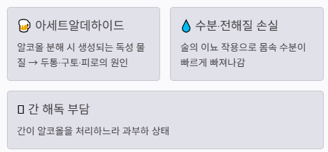 숙취는 단순히 “술이 덜 깼다”는 문제가 아니라 몸이 수분 부족, 전해질 불균형, 간 해독 부담을 동시에 겪고 있다는 신호입니다.