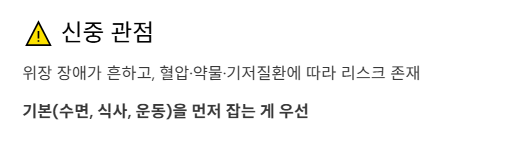 - 안전한 섭취법 : 소량 시작 → 식후/운동 전후로 → 물 충분히 → 이상 신호 시 즉시 중단
