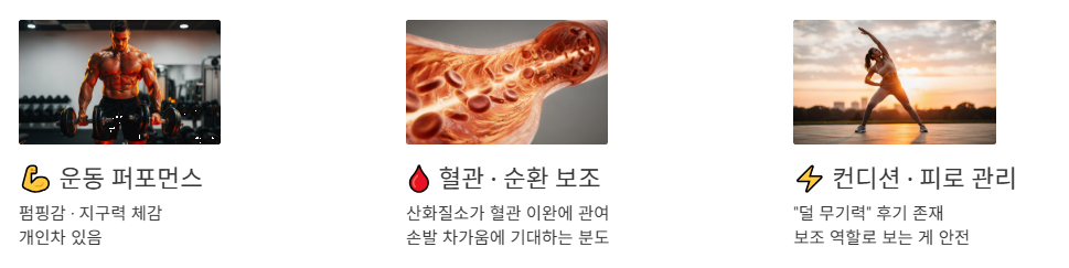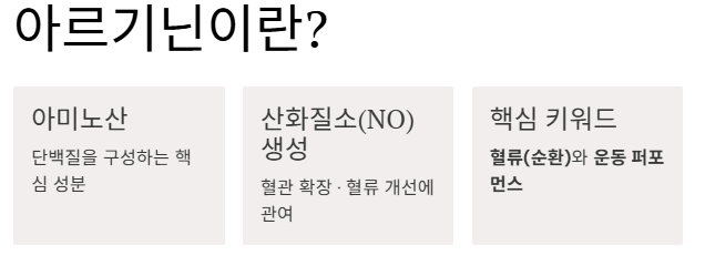 👉 핵심: 아르기닌의 핵심 키워드는 ‘혈류(순환)와 운동 퍼포먼스’입니다.