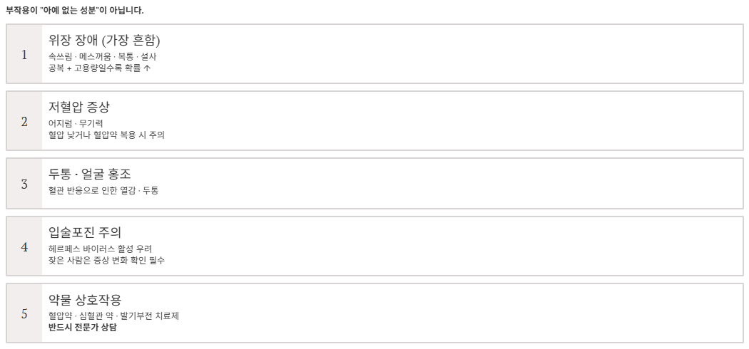 - 부작용 : 설사/복통 등 위장 장애, 어지럼(저혈압), 두통·홍조, 입술포진 잦은 사람 주의, 약물 복용 시 상호작용 가능