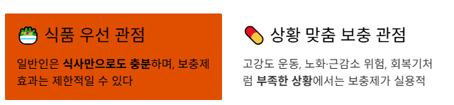 - 상황 맞춤 보충 관점: 고강도 운동, 노화로 인한 근감소 위험, 회복기처럼 “섭취가 부족한 상황”에서는 보충제가 실용적이라는 입장.