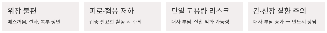 - 간·신장 질환이 있으면 특히 신중 : 대사 부담이 커질 수 있어 상담이 안전합니다.