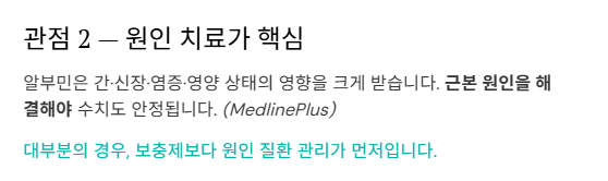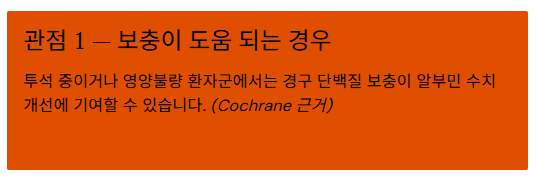 특정 환자군(예: 투석+영양불량)에서는 경구 단백질 보충이 알부민 수치 개선에 도움이 될 가능성이 있습니다. - 관점 2) 대부분은 ‘알부민 보충’보다 원인 질환/염증 관리가 핵심이다