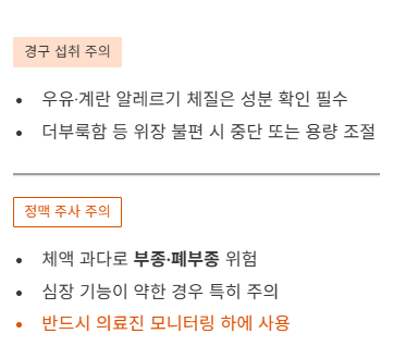 - 체액이 늘어 부종/폐부종 같은 과다수분 문제가 생길 수 있어, 특히 심장 기능이 약한 경우는 주의가 필요합니다(의료진 모니터링 영역).