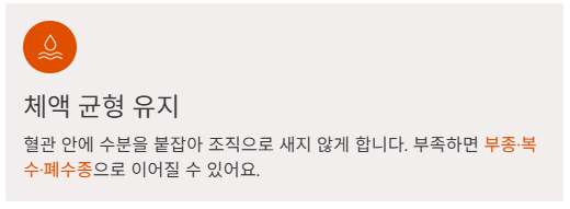- 혈관 안에 수분을 붙잡아 체액이 조직으로 새지 않게 돕습니다. 알부민이 부족하면 수분이 밖으로 빠져 부종(붓기), 복수, 폐에 물이 차는 문제로 이어질 수 있어요.