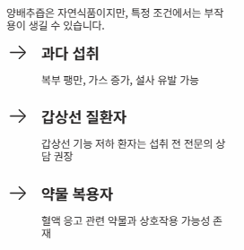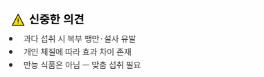 - 과다 섭취 시 복부 팽만 및 가스 증가