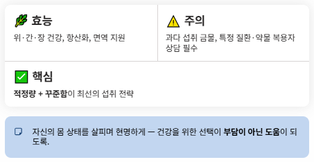 하지만 과다 섭취 시 부작용이 발생할 수 있으며, 개인 체질에 따라 효과가 다르게 나타날 수 있습니다.