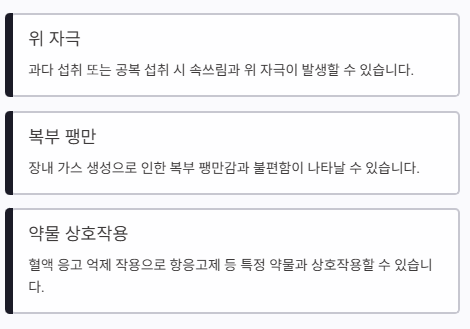 - 과다 섭취 시 속쓰림, 복부 불편감 발생 가능