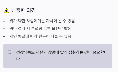 - 과다 섭취 시 속쓰림 및 위 자극