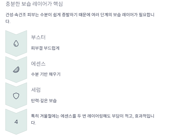 - 건성: 부스터 + 에센스 + 보습/탄력 세럼