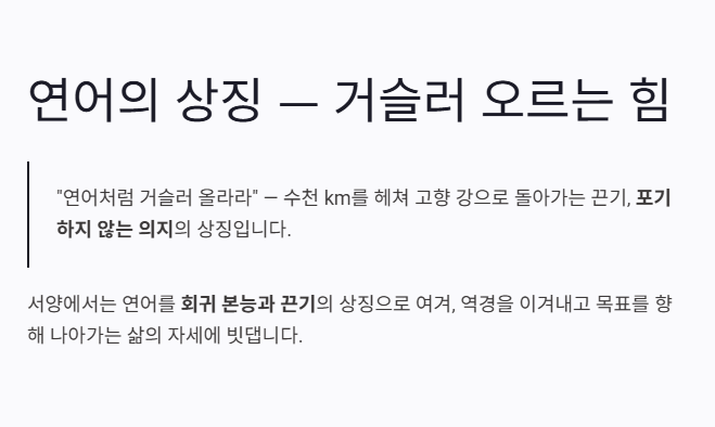 또한 “연어처럼 거슬러 올라라”라는 표현은 어려움을 이겨내고 목표를 향해 나아가라는 의미로 자주 사용됩니다.
