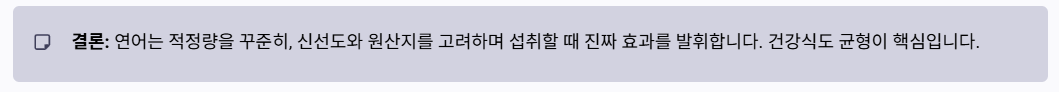 - 기생충 위험: 생연어 섭취 시 반드시 신선도 확인