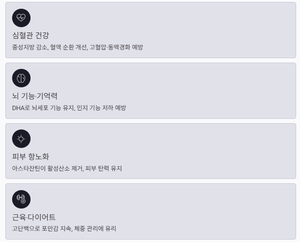 연어에 들어 있는 아스타잔틴은 강력한 항산화 물질로, 피부 노화 방지와 탄력 유지에 기여합니다.