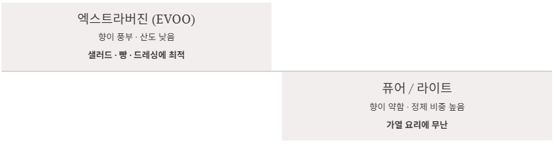 - 퓨어/라이트(정제 비중 높은 오일) : 향이 약해 가열 요리에 무난하지만, ‘풍미’는 적습니다.