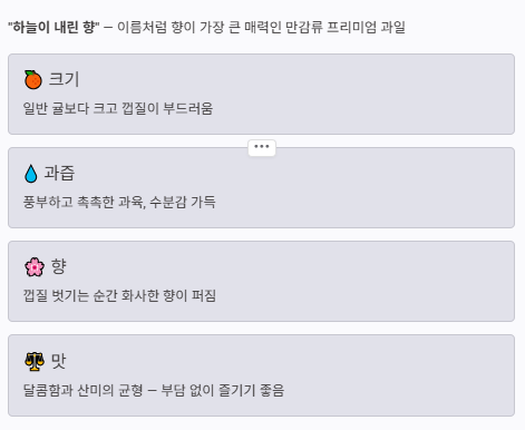 이름 그대로 하늘이 내린 향이라고 불릴 만큼 향에 대한 만족도가 높아 겨울철 프리미엄 감귤류로 자주 언급됩니다.