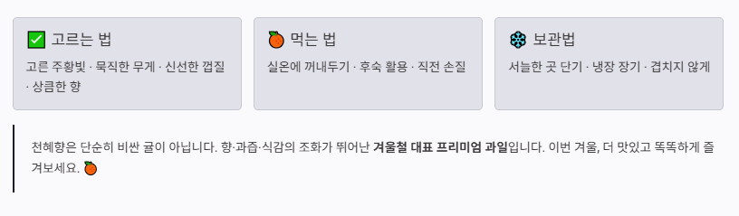 정리하면 천혜향은 단순히 비싼 귤이 아니라, 향과 과즙, 식감의 조화가 뛰어난 겨울철 대표 과일입니다.