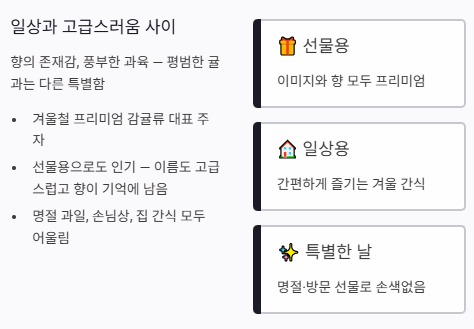 일반 귤보다 특별한 만족감을 주고, 선물용과 가정용 모두 잘 어울리는 과일로 사랑받고 있습니다.