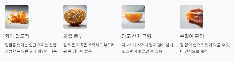 일반 귤은 친숙하고 먹기 편하지만, 개체별 맛 차이가 느껴질 수 있습니다.