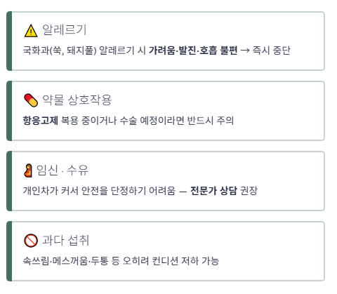 하지만 국화과 알레르기, 약물 복용(특히 항응고제), 임신·수유, 과다 섭취는 주의해야 해요.