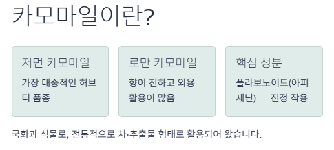 핵심은 카모마일에 들어 있는 플라보노이드(예: 아피제닌) 같은 성분이 진정 작용과 관련이 있다고 알려져 있다는 점이에요.