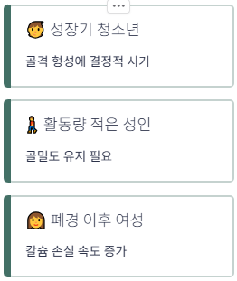 특히 성장기 청소년, 활동량이 적은 성인, 중장년층, 폐경 이후 여성은 칼슘 관리가 더 중요합니다.