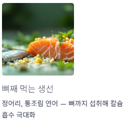 대표적으로 정어리, 통조림 연어 같은 식품이 자주 언급됩니다.