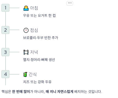 간식으로는 치즈나 강화두유를 활용할 수 있습니다. 핵심은 한 번에 많이 먹는 것이 아니라, 매 끼니에 칼슘 식품을 자연스럽게 배치하는 것입니다.