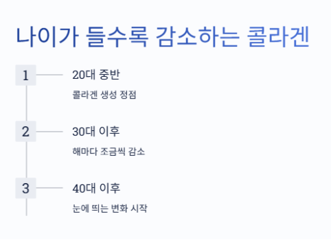 - 콜라겐이 줄어들면 피부가 얇아지고 쉽게 처질 수 있습니다.