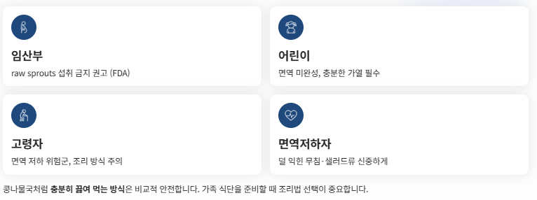 콩나물국처럼 충분히 끓여 먹는 방식은 비교적 안전하지만, 덜 익힌 무침이나 즉석 샐러드류는 신중할 필요가 있습니다.