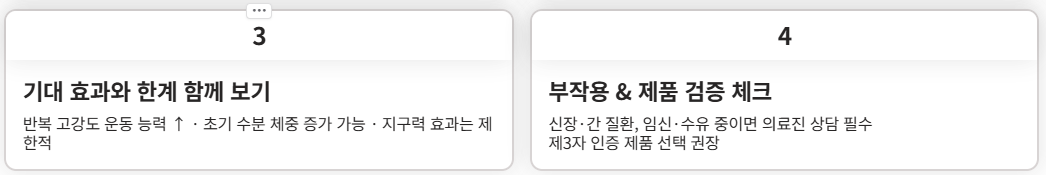 그 세 가지만 기억해도 크레아틴을 훨씬 안전하고 똑똑하게 활용할 수 있습니다.