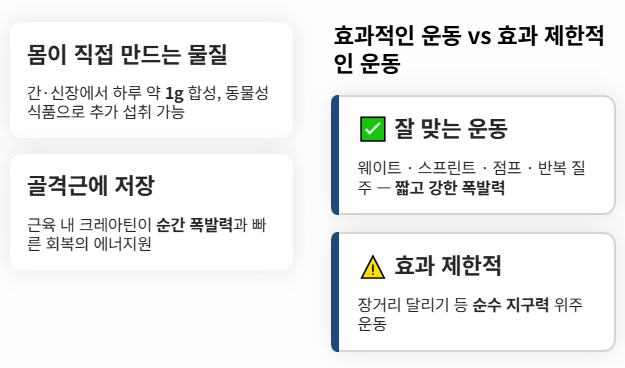 몸속 크레아틴의 대부분은 골격근에 저장되며, 특히 웨이트트레이닝·스프린트·점프·반복 질주처럼 순간 폭발력과 짧은 회복이 반복되는 운동에서 의미가 큽니다.