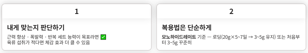 내 운동 목표를 먼저 정하고, 모노하이드레이트 기준으로 단순하게 접근하고, 기존 질환이나 검사 일정이 있다면 의료진과 상의하는 것.