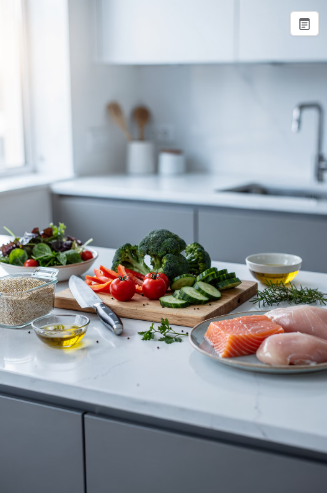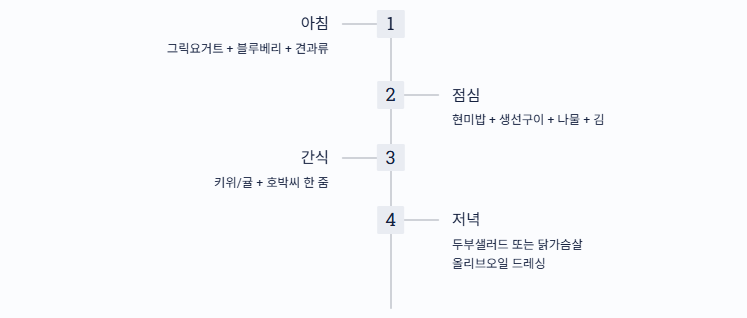 - 저녁: 두부샐러드 또는 닭가슴살 + 올리브오일 드레싱