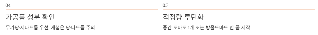 토마토주스·소스는 무가당/저나트륨을 우선으로 보고, 케첩은 “토마토”가 아니라 “당과 나트륨”을 먹는 경우가 많다는 점을 기억하세요.