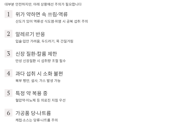 다만 위가 약한 사람에게는 속 쓰림, 일부에게는 알레르기, 신장 질환 등 칼륨 제한이 필요한 경우에는 섭취 조절이 필요해요.