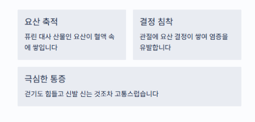 즉, 몸에서 요산이 많이 만들어지거나, 잘 배출되지 않을 때 발생합니다.