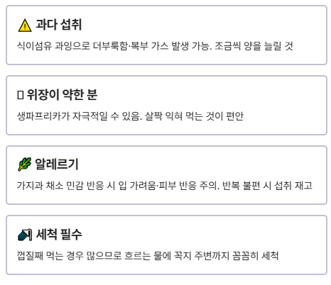 반면 많이 먹으면 복부 팽만이나 속 불편이 생길 수 있고, 위장이 약한 사람이나 특정 채소에 민감한 사람은 주의가 필요합니다.